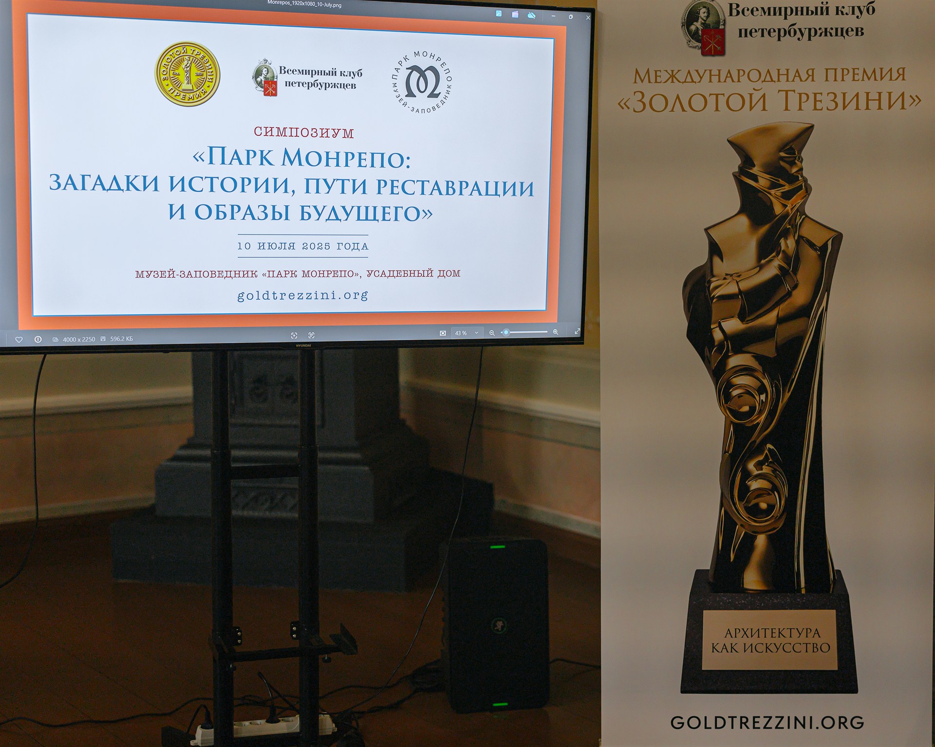 Центральным событием дня стал симпозиум «Парк Монрепо: загадки истории, пути реставрации и образы будущего», прошедший в Усадебном доме. На открытии заседания с приветствиями выступили директор музея-заповедника Александр Смирнов, председатель оргкомитета премии «Золотой Трезини», член Всемирного клуба петербуржцев Павел Черняков и инвестор Эдуард Горин, который сегодня активно занимается развитием города Выборга и Ленинградской области. В числе реализованных им проектов — общественно-деловое пространство SENO в Санкт-Петербурге.